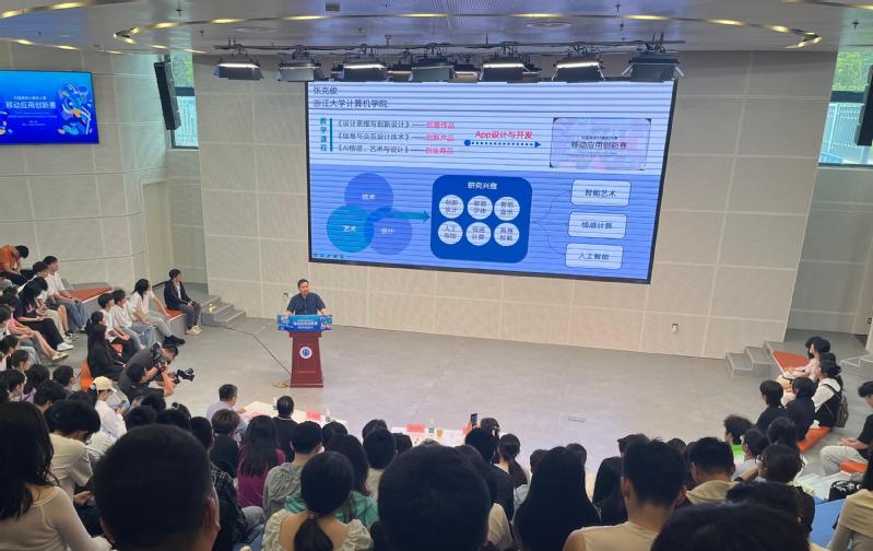 活动伊始,大赛组委会主任、浙江大学国际设计研究院副院长张克俊教授作了《移动应用创新能力培养:需求解构、方案建构与产品重构》专题分享。他从“大模型改变了什么”这一前沿视角切入,深入剖析了认知的改变、范式的改变以及生态的改变对移动应用创新的影响。张克俊结合典型案例,系统阐述了如何通过需求解构精准定位用户痛点,利用方案建构实现技术突破,最终完成产品重构并推向市场。他特别指出,在AI技术迅猛发展的背景下,移动应用创新正迎来前所未有的机遇与挑战,鼓励学生积极拥抱新技术,培养跨学科思维。