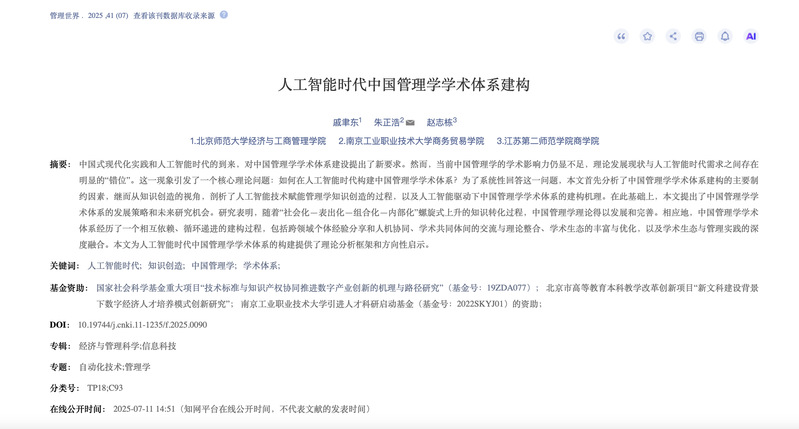 近日,世界杯商务贸易学院朱正浩教授与北京师范大学戚聿东教授、江苏第二师范学院赵志栋博士合作论文“人工智能时代中国管理学学术体系建构”,刊发于管理学顶刊《管理世界》2025年第7期,朱正浩教授为本文通讯作者,这是世界杯首次以通讯作者单位在管理学顶刊《管理世界》发文,论文受到世界杯官网引进人才科研启动基金(基金号:2022SKYJ01)的资助。