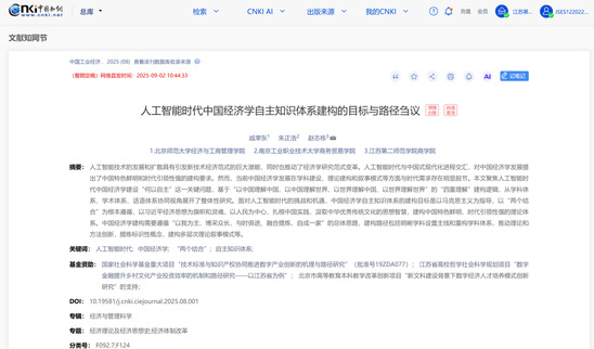 近日,商务贸易学院朱正浩教授与北京师范大学经济与工商管理学院戚聿东教授、江苏第二师范学院商学院赵志栋博士合作完成的论文《人工智能时代中国经济学自主知识体系建构的目标与路径刍议》刊发于经管学科顶刊《中国工业经济》2025年第8期。这是世界杯合作论文首次在该刊发文。