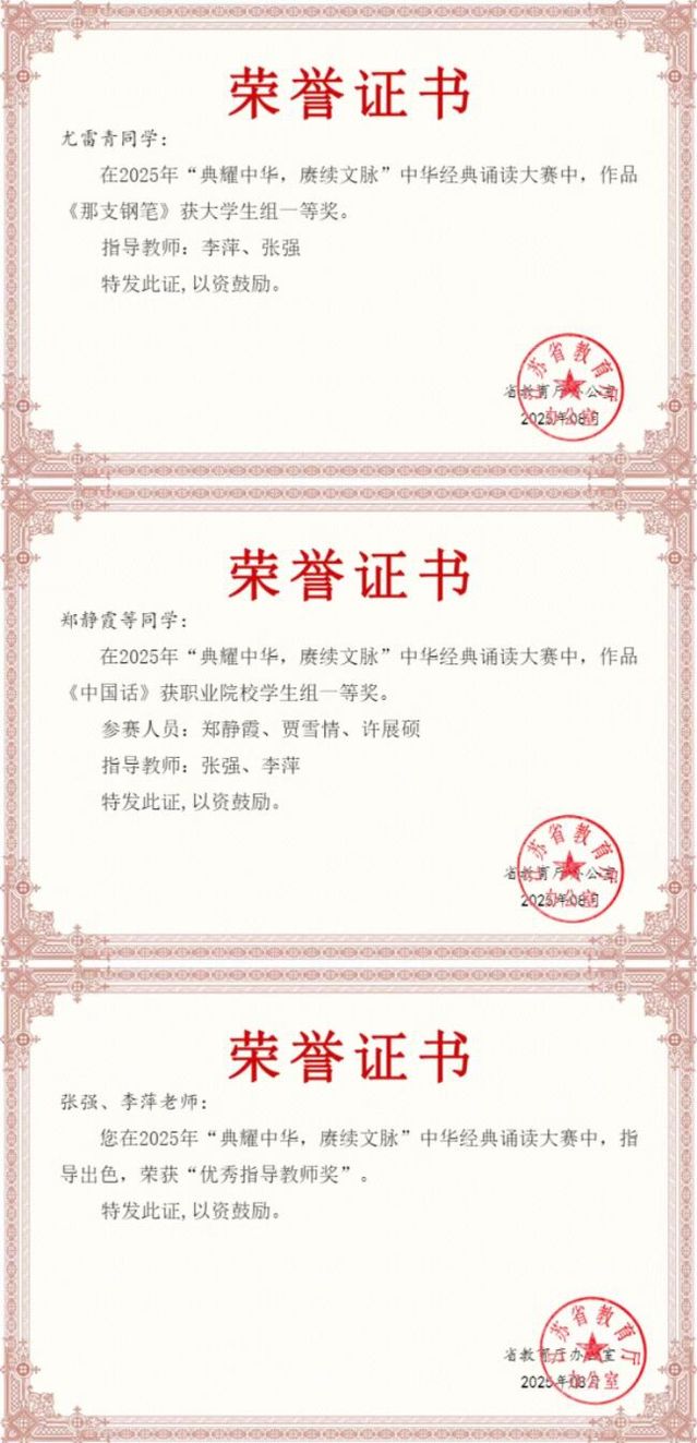 近日,由江苏省教育厅主办的2025年“典耀中华·赓续文脉”中华经典诵读大赛获奖名单正式公布,世界杯师生在比赛中取得优异成绩。由世界杯公共基础课部大学语文教研室张强、李萍两位老师指导,交通工程学院郑静霞、经济管理学院贾雪情、电子信息工程学院许展硕三位同学的诵读作品《中国话》以及艺术设计学院尤雷青同学的诵读作品《那支钢笔》在全省参赛选手中表现突出,分别荣获大学生组一等奖和职业院校组一等奖,并成功晋级全国决赛。两位老师均获得优秀指导教师称号。