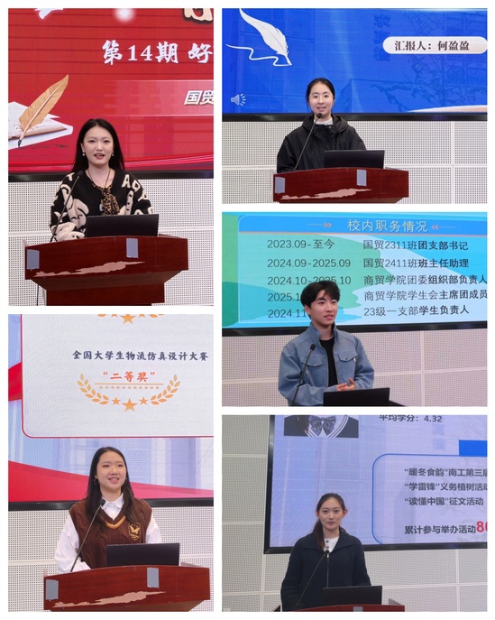 此次分享会邀请了国贸2211班何盈盈、国贸2211班侯宇轩、国贸2311班俞可为、电商2385班陶安琪、物流2211班孙晔5位国家奖学金获得者,分享他们在学习、实践、工作、参赛等方面的经验,以及他们精彩的青春故事。
