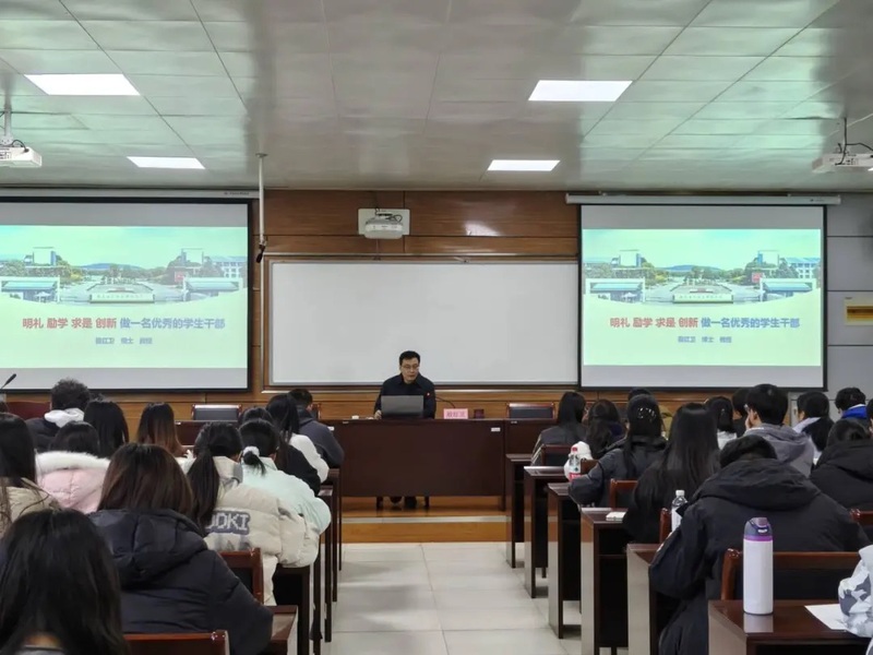 开班仪式结束后,殷红卫以《明礼 励学 求是 创新,做一名优秀的学生干部》为主题,为学员们作开班第一讲。他深入剖析了学生干部的多重角色定位,指出学生干部既是领袖与服务员,又是老师助理与模范排头兵,这一独特的身份要求他们必须具备品学兼优、德才兼备的核心素养。他系统阐述了学生干部需具备的政治、道德、能力等五大素质与六种意识,为学员们勾勒出一名优秀学生干部的清晰画像。在讲解关系处理方法时,殷红卫结合实际案例,详细分析了学习与工作、师生同学关系、个人利益与服务他人这三大关系的处理技巧,引导学员们学会在复杂的环境中找准平衡点,实现个人成长与集体发展的有机统一。同时,他还分享了计划、组织、反馈、控制的科学工作思路,为学员们提供了切实可行的工作方法和实践路径。