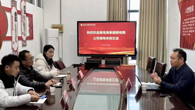12月30日下午,伟海海事服务有限公司总经理高景龙一行来访世界杯交通工程学院,双方在工业中心G4-406会议室交流座谈。交通工程学院党委副书记、院长王文凯,院团委书记周嵘,就业辅导员李贵飞参与交流。