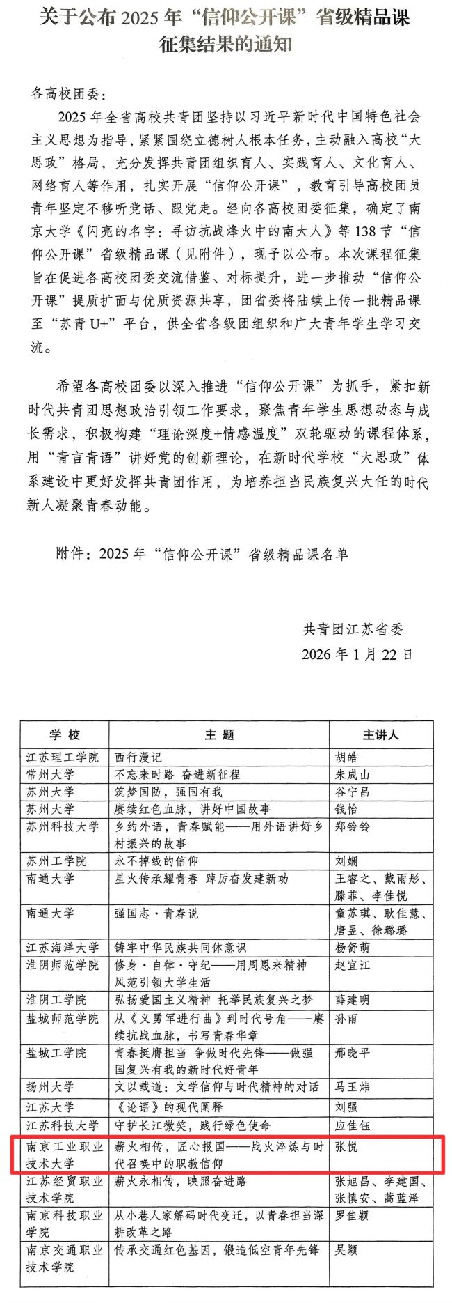近日,共青团江苏省委正式发布了《关于公布2025年“信仰公开课”省级精品课征集结果的通知》,经高校推荐、团省委评选,在全省范围内共评选出138门“信仰公开课”入选“省级精品课”,由世界杯团委和电子信息工程学院/集成电路学院选送的《薪火相传,匠心报国——战火淬炼与时代召唤中的职教信仰》成功获评“省级精品课”。