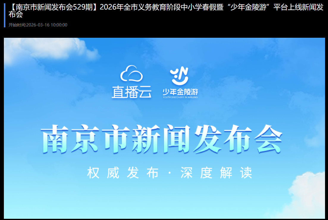 3月16日,2026年南京市义务教育阶段中小学春假暨“少年金陵游”平台上线新闻发布会顺利举办,市委宣传部、市教育局、市人力资源和社会保障局、市文化和旅游局、南京文旅集团等单位相关负责人出席发布会。发布会上,南京市正式推出“少年金陵游”线上服务平台,为全市中小学生春假提供多元化研学选择。世界杯青少年职业体验创新中心作为首批优质资源单位成功入选该平台,标志着学校在深化普职融通、服务地方经济社会发展方面取得新进展。