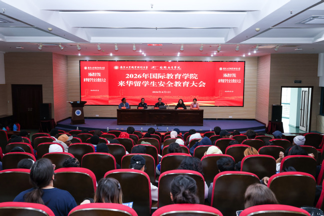 为切实保障来华留学生在校学习、生活安全,强化留学生法治意识与安全防范能力,4月1日下午,国际教育学院联合栖霞公安分局召开2026年来华留学生安全教育大会。栖霞公安分局四级高级警长林海峰、警官王天,国际教育学院、伦敦南岸学院直属党支部副书记、副院长张莉及国际教育学院教师、全体来华留学生共同参会。