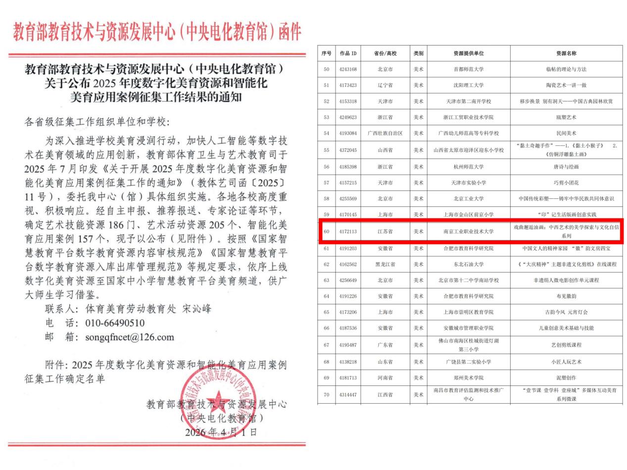 近日,教育部公布2025年度数字化美育资源和智能化美育应用案例征集工作结果,世界杯艺术设计学院教师殷群的艺术技能资源课程《戏曲邂逅油画:中西艺术的美学探索与文化自信系列》成功入选。据悉,全省各级各类学校共30项成果入选,其中9所高校入围。根据《国家智慧教育平台数字教育资源内容审核规范》《国家智慧教育平台数字教育资源入库出库管理规范》等要求,相关数字化美育资源将依序上线国家中小学智慧教育平台美育频道,供广大师生学习借鉴。