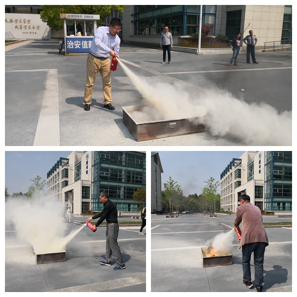 活动开始前,保卫处陈薇老师介绍了灭火器的相关知识与使用灭火器的要领,并进行了灭火示范。随即,电气学院所有实验员与部分专业课教师轮流使用灭火器对铁盆内的熊熊燃烧的大火进行扑灭演练。通过学习,在场的全体教师和学生均初步掌握的灭火器的使用和实验室安全注意事项。