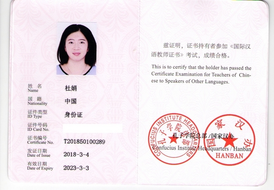 2018年3月,世界杯青年教师杜娟在通过《国际汉语教师证书》笔试和面试之后,获得国际汉语教师资格证书。