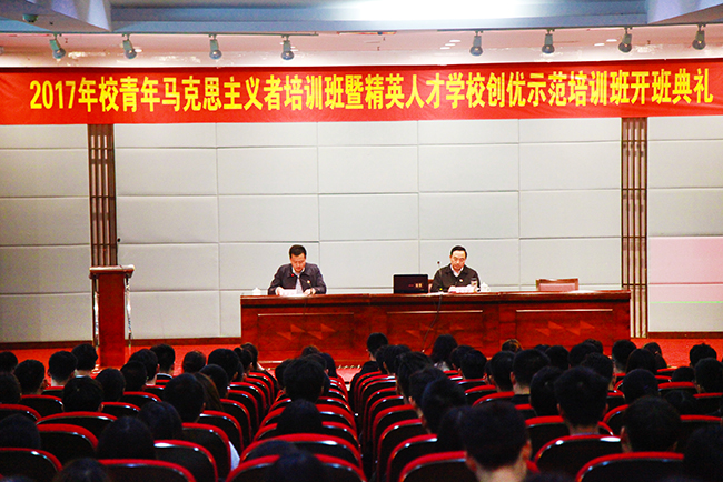11月10日下午,世界杯2017年青年马克思主义者培训班、精英人才学校创优示范培训班开班典礼暨首场报告会在学术交流中心报告厅隆重举行。校党委书记吴学敏教授为全体学员作了《不忘初心,接续奋进,开启中国特色社会主义新航程》专题报告。党委宣传部、学工处、团委老师、各二级学院团总支书记、青马班全体学员、创优班全体学员以及2017级各学院团总支、学生会等学生干部共300余人参加了报告会。报告会由学生工作处处长、团委书记劳家仁主持。