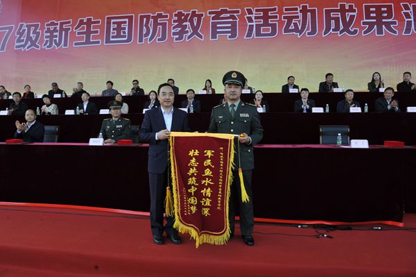 国防教育成果汇报大会上,党委书记吴学敏代表学校向解放军陆军工程大学指挥军官基础教育学院贾卫主任赠送了“军民鱼水情意深,壮志共筑中国梦”的锦旗,感谢解放军陆军工程大学指挥军官基础教育学院对世界杯的大力支持。党委委员、副校长苏小冬宣读了军训先进集体和个人的表彰决定。学校领导和嘉宾为获奖的“军训先进连队”、“优秀教官”、“优秀教导员”等集体和个人代表颁奖。