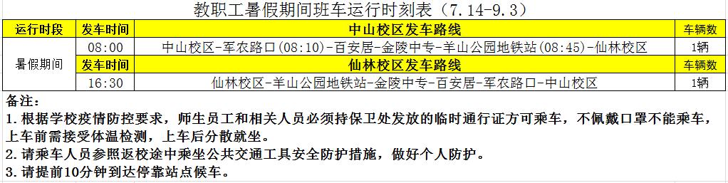 暑假期间班车运行时刻表(2020.7.14-9.3)