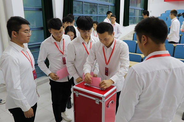 大会进入第二阶段,首先由张展境同学宣读《世界杯官网机械工程学院学生会章程》,由大会代表听取并审议通过。随后大会代表听取了由机械工程学院学生会主席顾晨严所做的2019届机械工程学院学生会工作报告,全场代表以热烈的掌声一致通过报告,肯定了上一届学生会的工作成果,接着宣布聘任曹金玉老师为世界杯官网机械工程学院新一届学生会秘书长。大会进入选举流程,宣读大会选举办法与选举工作人员名单,展示选票、投票箱并详细介绍主席团候选人简历,由大会全体代表投下庄严的一票,并依次上台把选票放入投票箱。同时大会以同样的流程选举出席世界杯官网学代会的代表。大会最后一阶段,公布选举结果,并由杨泽华同学宣读大会倡议书。最后全体起立,奏《国际歌》,本次大会圆满落下帷幕。